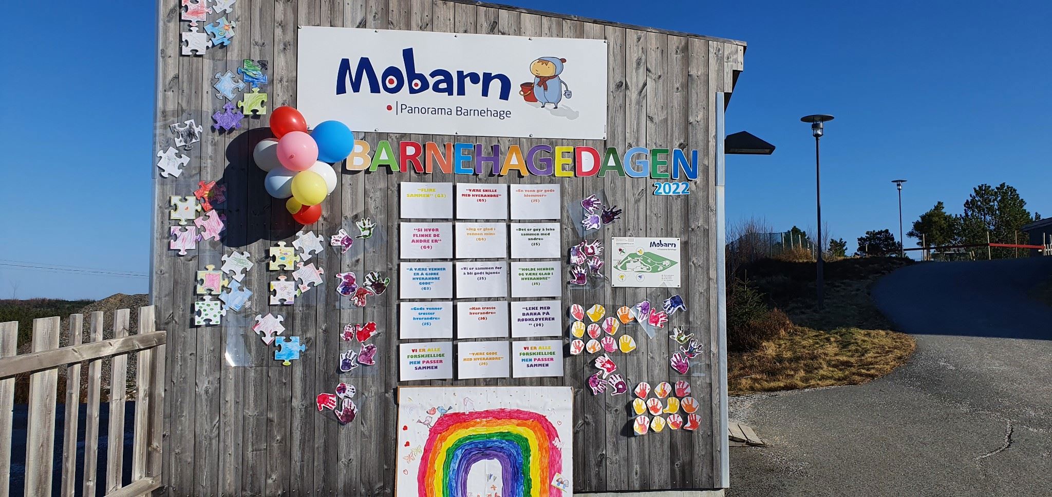 Rett ved porten er det også en hel vegg som viser prosjektet vårt relatert til tema for barnehagedagen, nemlig vennskap. Barna har hatt stort medvirkning i dette prosjektarbeidet, de har selv kommet med sitater om vennskap som nå henger på veggen, de har malt regnbue, håndavtrykk, og laget et fantastisk vennskapspuslespill.